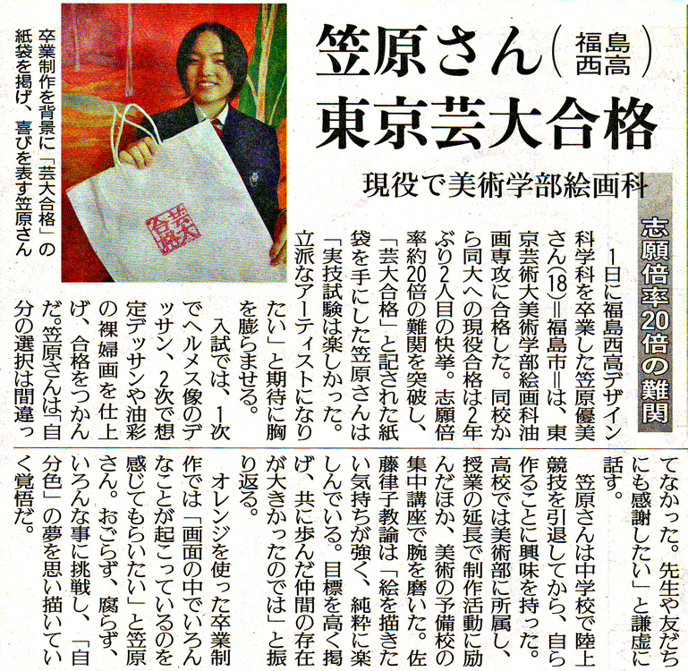 東京藝術大学現役合格の記事が福島民友(3/21)に掲載されました。geidai.jpg