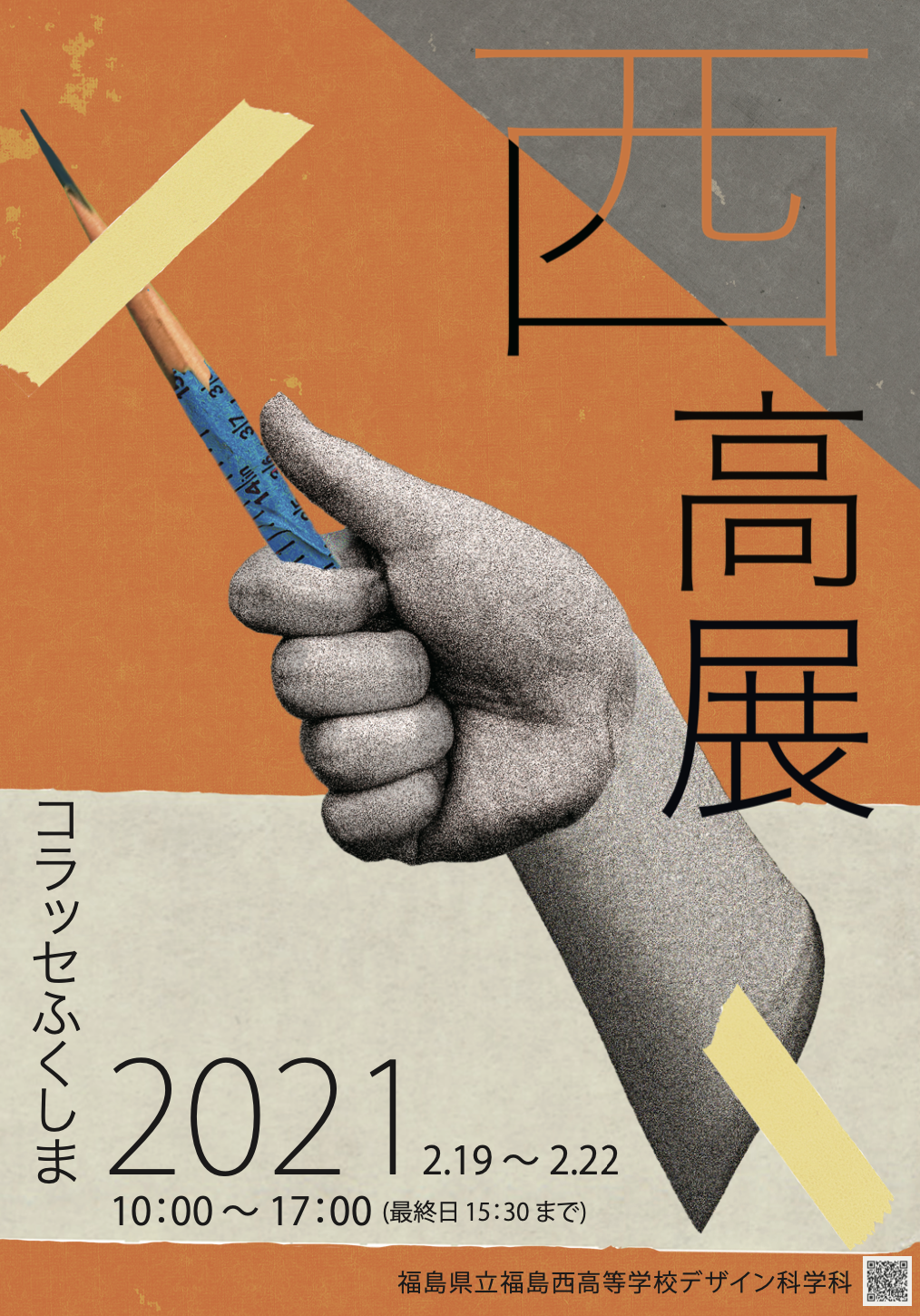 福島西高校デザイン科学科2年FA(ファインアート)・VD(ヴィジュアルデザイン)・MA(メディアアート)コースと1年生の作品約110点展示予定です。ぜひ会場に足をお運びください。